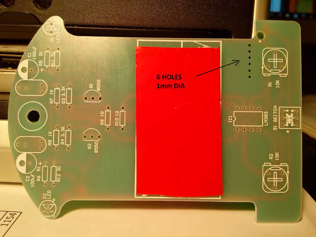 Perfore la PCB fabricación de 6 pequeños orificios de aproximadamente 1mm de diámetro en la posición demostrada en el cuadro. Generalmente el HC-05 (módulo de 6 pines) vienen con un macho conector soldado tan Inserte el módulo (en el mismo lado de la batería). En el otro lado: