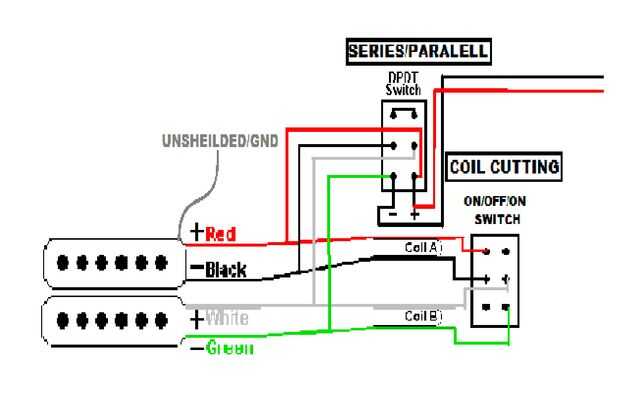 Para las modificaciones de wireing necesita tener un pastilla humbuckers y el diagrama de wireing para use este enlace y rastrear los cables. Incluso puede ayudar a chang a los colores de los cables en mi diagrama.