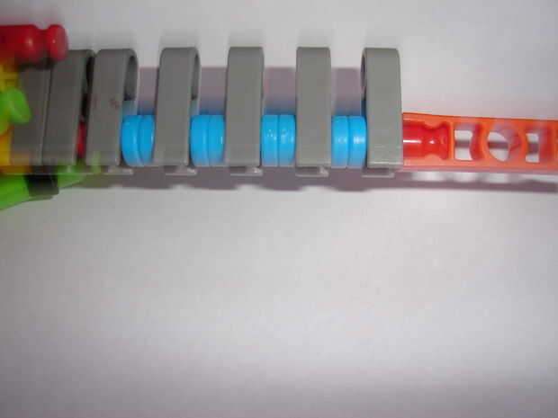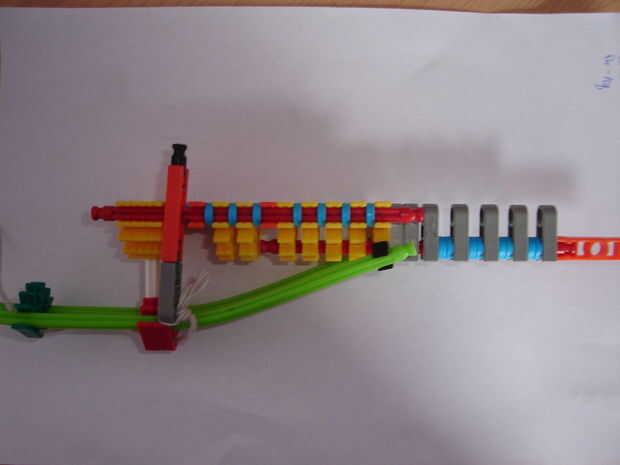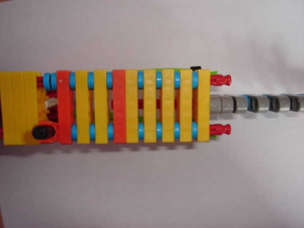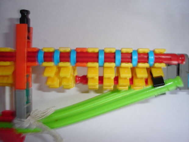 esta es el arma más poderosa de K'NEX creo que porque puede perforar 2 cerveza o COLA puede y destruir disco compacto fácilmente debido a la muy fuerte 4 gomas (yo uso 2 ligas diferentes) también incluye una gran revista para 5 K'NEX largo gris afila