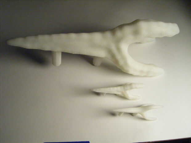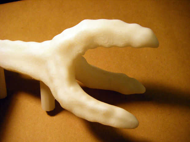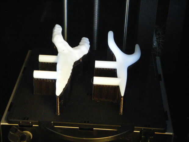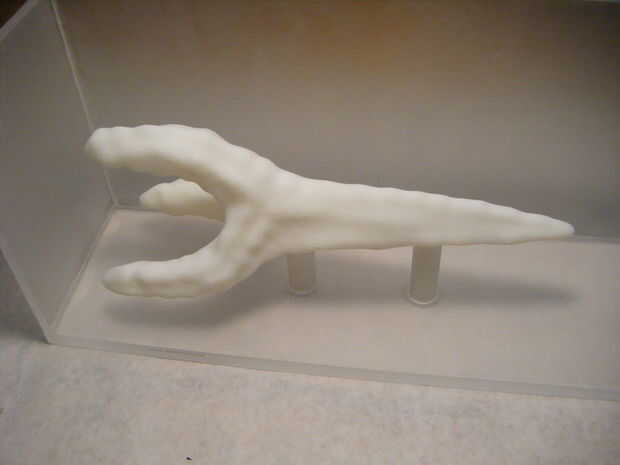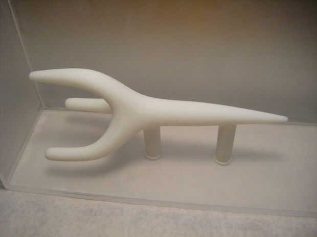 Los archivos terminados fueron enviados a una impresora Dimension SST 1200 ABS. Imprime por capas calentado ABS plástico y un material de soporte en. 010" capas. El material de apoyo se disuelve lejos cuando se coloca en un baño especial después de que el modelo ha terminado la impresión. Los modelos ABS son durables y pueden ser moldeados varias veces frente a un modelo de arcilla que generalmente se destruye en el proceso de moldeo. Esto reduce el desperdicio de materiales y puede permitir varios moldes para hacer si muchos bastidores será necesarios. Si desea mayores detalles, usted podría esculpir en la superficie con arcilla o si desea una solución permanente, Apoxie Sculpt de Aves es grande. Es una arcilla sintética no inflamable, no-peligrosos que establece un 2-3 horas sin contracción. En este caso, me gusta la textura de la huella digital como la impresora a la izquierda detrás, así que decidí dejar el modelo de cómo era. Antes de comprometerse a la escultura de tamaño completo, imprimí versión de escala de un cuarto de cada uno para asegurarse de que eran lo que quería. Puedes ver cómo la base y escultura de registro en una caja del molde de prueba.