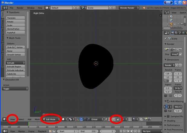Exportar el archivo de Sculptris (obj con un icono de flecha hacia abajo) e importar ese obj en Blender (archivo > Importar > OBJ). Si eres nuevo en la licuadora, eliminar el cubo de arranque primero con el ratón sobre el área de trabajo, eliminar de golpe, luego haga clic en eliminar en el menú emergente poco. Haga clic con el botón derecho el sculpt y cambiar a modo edición (circundado en mi imagen). Haga clic en ver y cambiar a la derecha. Si el modelo es naranja (triángulos seleccionados) golpear un teclado para anular la selección todo (debe ser todo negro). Ahora encienda (cubo con una cara naranja en el círculo rojo a la derecha) seleccionar la modalidad de cara y desactivar selección límite visible (cubo con puntos en la esquina en el mismo círculo). B ahora golpe en el teclado para activar la casilla seleccionar. Izquierda haga clic y mantenga pulsado Inicio su cuadro y liberación para poner fin a su caja. Utilícelo para seleccionar sólo la cara de su escultura. Haga clic en vista otra vez, este vez selección frontal. Haga clic en U en el teclado y seleccione proyecto de vista (límites).