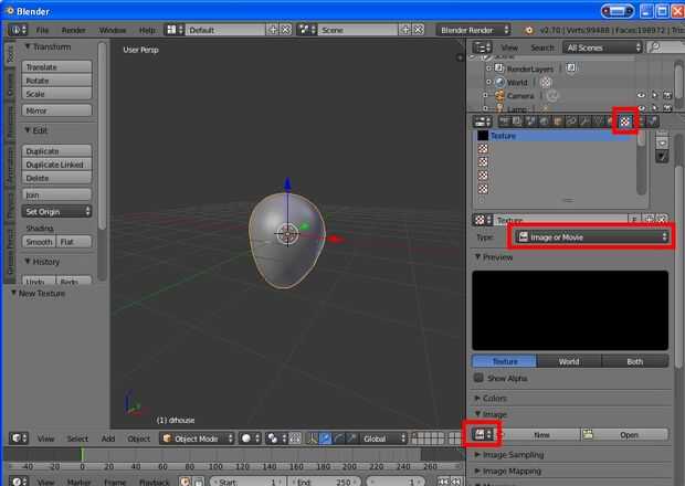 Cambiar a vista 3D de UV/Image editor. Cambiar al modo de objeto de modo de edición. Haga clic en la esfera indicada en la imagen. Se trata de la configuración material de las piezas. Si allí no es un juego (si la pantalla se ve como mi imagen), haga clic en nuevo. Haga clic en el icono de cuadros al lado de la esfera. Esta es su textura. Haga clic en nuevo. Donde dice las nubes, haga clic en y cambiar a la imagen o película. Abajo inferior podrá ver de nuevo y abrir. Haga clic a la izquierda de nuevo, y usted podrá seleccionar su imagen que ha cargado en el editor UV/Image.