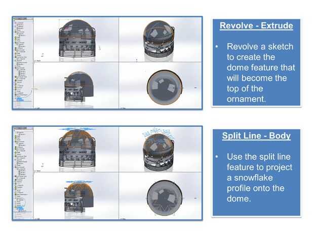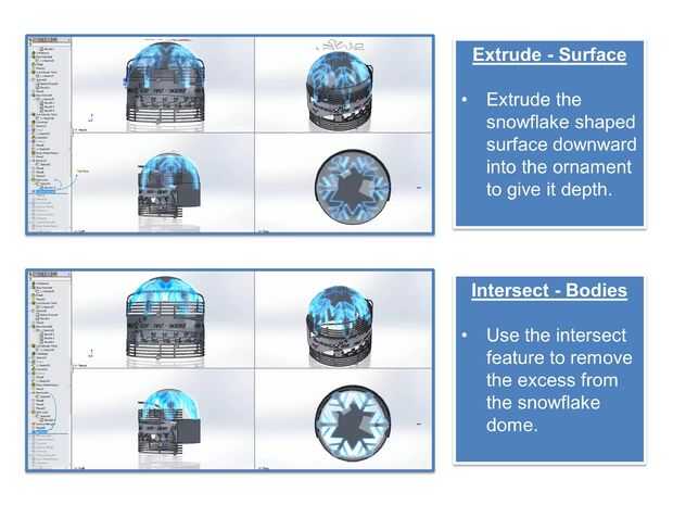 A continuación, crear una cúpula sobre el cilindro que has decorado con las características envueltas. Para agregar el detalle a la cúpula, he utilizado funciones avanzadas como la línea de fractura, extrusión de superficie y Intersect. La combinación de estas características me permitió proyectar un dibujo de un copo de nieve sobre la cúpula, luego quitar el exceso de material a terminar con una cúpula de copo de nieve 3D!