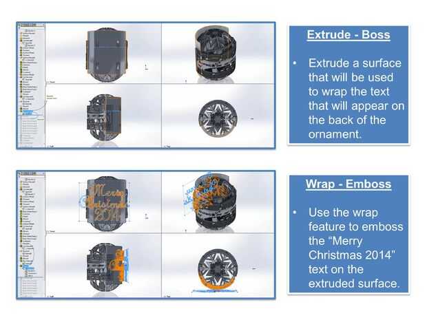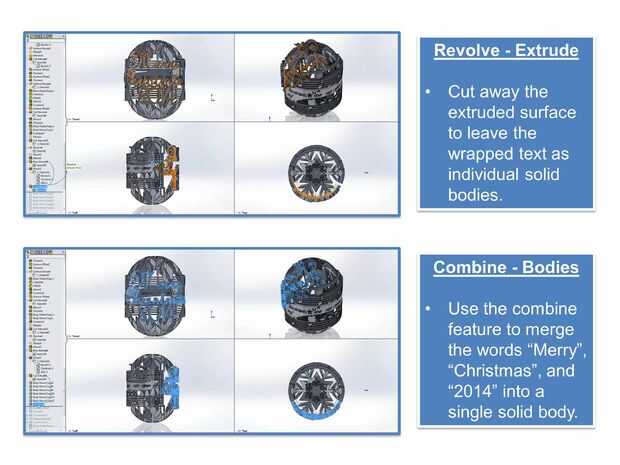 La geometría en la cara posterior del ornamento fue creada de la misma manera que la música fue agregada al frente. Las palabras "Feliz", "Navidad" y "2014" se modelaron como cuerpos individuales para permitir mover y ajustar. Una vez localizado por lo que todos ellos se cruzan, utilicé la función combinar hacer el adorno en un solo cuerpo sólido.