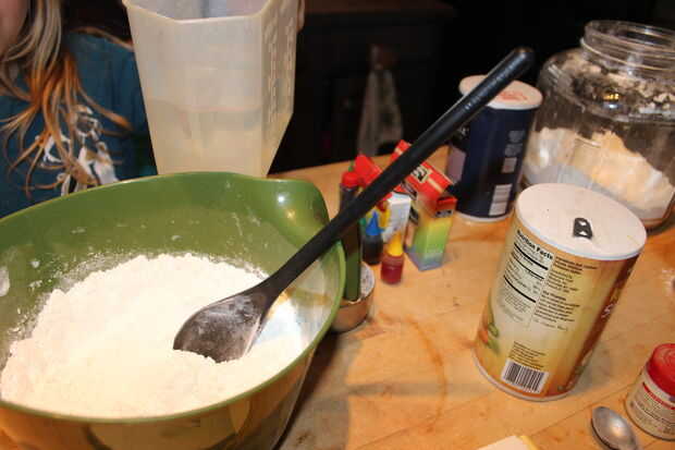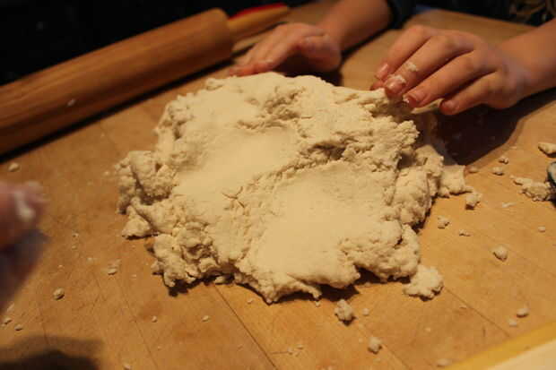 2. agregar agua un poco a la vez y revuelva con la mezcla de harina hasta que quede como masa de empanada.