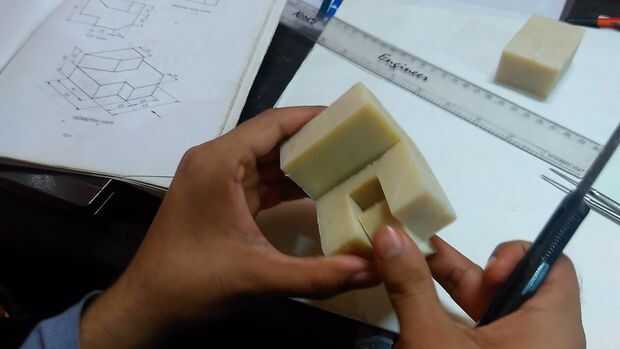 Desde entonces, la parte inferior del bloque tiene bordes intrincados, es preferido para tomar en último. Permítanos primero corte la cavidad superior. Se utiliza el divisor para marcar puntos y cortador pequeño para hacer pequeños cortes en la superficie. Un poco profundizar en estos cortes y repetir este proceso hasta que se afloje la parte entera.