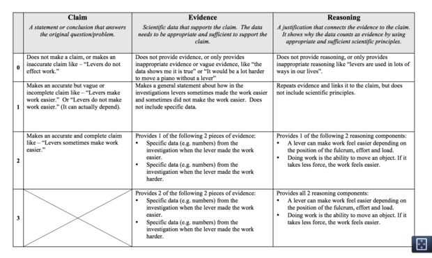 Para mantener la calificación de modelos de estudiante uniforme y fácil de entender por los estudiantes, utilizar la misma rúbrica a lo largo del semestre. Se llama una rúbrica "reclamo, evidencia y razonamiento". Los estudiantes son evaluados en si señalan la afirmación de que estaban investigando, las pruebas que recogidos/observados/medidos durante su investigación de la demanda y su razonamiento explicando cómo la evidencia se refiere a la reclamación.