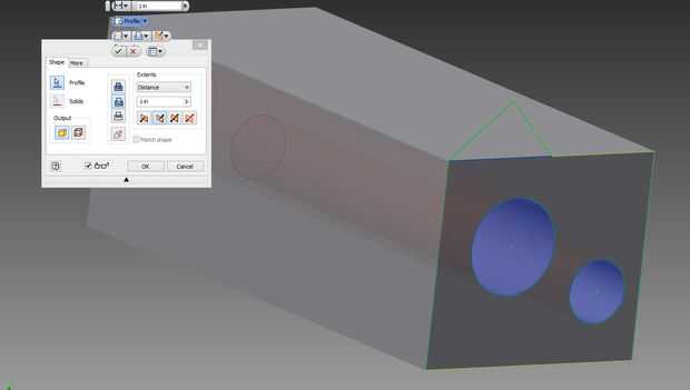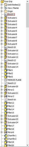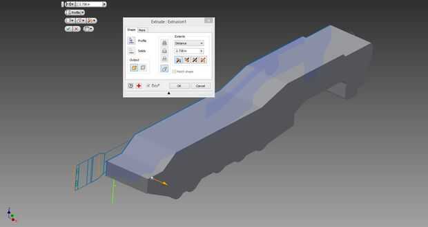 2. cuando haga su primera parte, golpeó el bosquejo nuevo y seleccionar un plano. Copiar / bosquejo pasado el boceto 2d que en AutoCAD y pulse guardar. SALVAR SU PARTE A MENUDO! Aquí usted hará su primera extrusión para hacer una base para modificar. La imagen de arriba muestra la función de extrusión para hacer la mayor parte de la empuñadura delantera. Simplemente haga clic en extrusión y luego el contorno de que parte le gustaría crear. Trabajo en partes pequeñas. Esto es donde las vistas circundantes en el 2D sketch útil, ahora sabes que entrar como el ancho de esta parte. Después de una extrusión base, luego modificamos para convertirse en la parte final. La siguiente es la lista de modificaciones realizadas en esta base para crear la parte final.