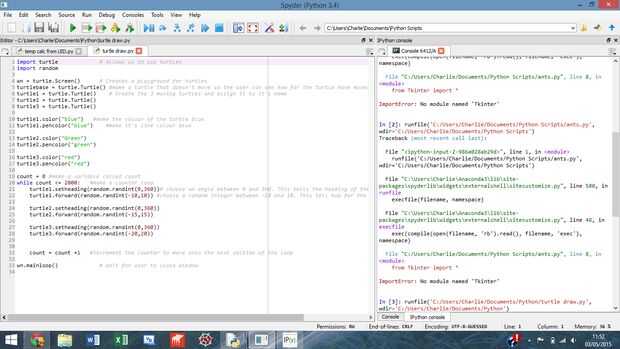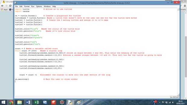 turtle1.Forward(Random.randint(-10,10)) #choose un entero aleatorio entre -10 y 10. Esto indicará hasta qué punto la tortuga se va a mover
