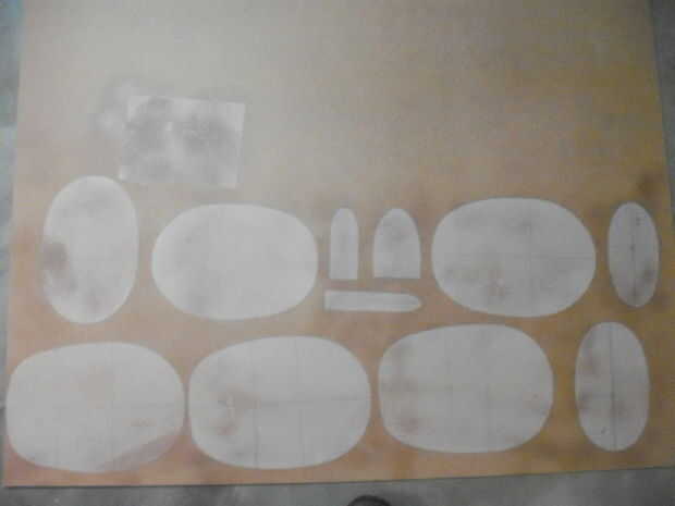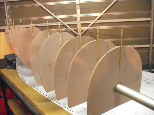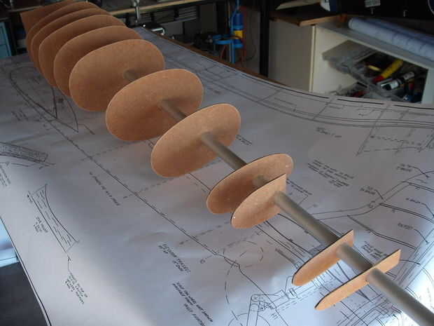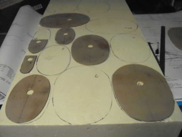 Proceso para empezar era tedioso, copiar cada plantilla del avión con papel de redacción. Podríamos haber hecho lo más fácil pero el costo de copiar el plan con la intención de cortar para arriba fue un desperdicio de fondos y logró que el papel de alguien que fue tirando hacia fuera. Una vez que en su trazado y corte estos donde pegado a la tabla con 77 M 3. Nos aseguramos de que cada plantilla tenía el centro marcado y un orificio de 22mm perforado. Esto es donde el carril de cortina reciclada vendría práctico, ya que esto las cuadernas es lugar.