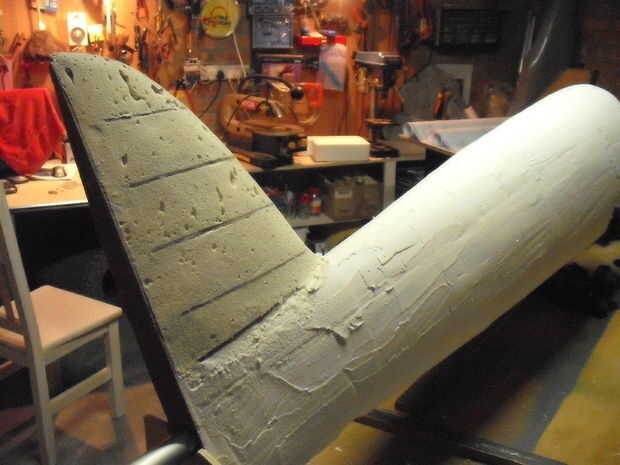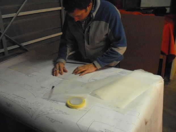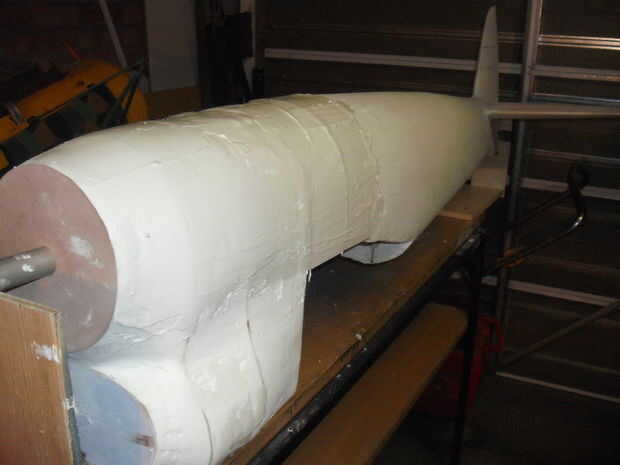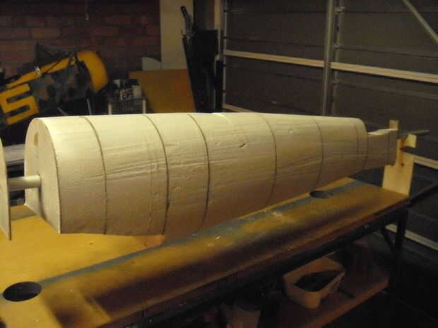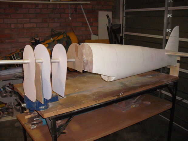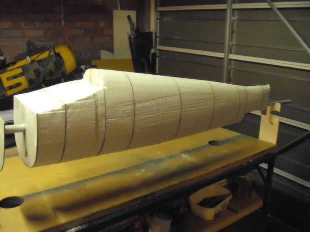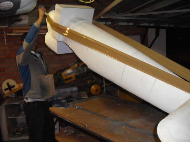 Mientras que el relleno se secaba en el fuselaje empezamos en la puñalada horizontal, esto caliente alambre después de la redacción de la forma y plantillas en la espuma. Las lengüetas horizontales son caliente del alambre cortado y luego laminado con espuma en aerosol. La espuma spray se extiende por aplanar la espuma. Esta es luego aplicada a los espacios en blanco y comprimido. la toma de espuma aerosol alrededor de 30 minutos para definir y luego está listo para el manejo.