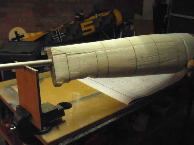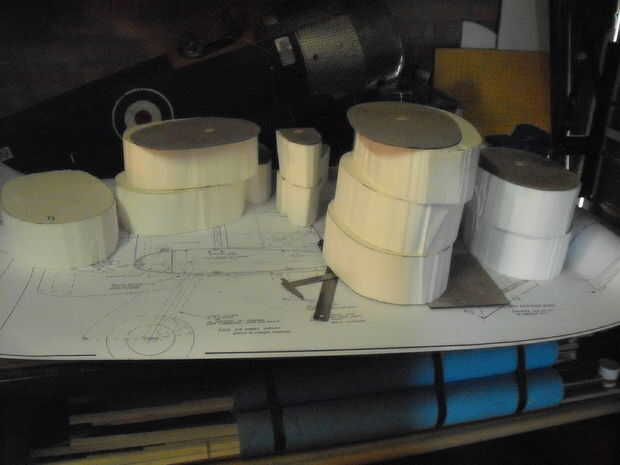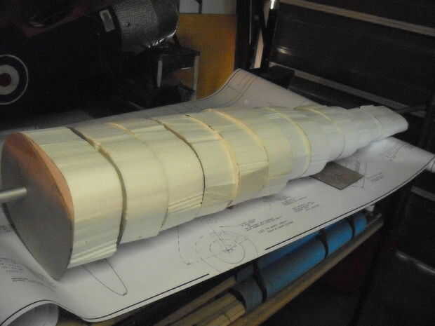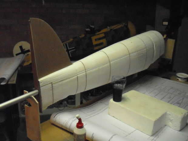 Después de que todos los formadores de secado en lugar caliente toda la espuma sobrante de alambre luego bloque de lija en el fuselaje. las cuadernas de nariz corta, donde luego aplicamos y recibió el mismo treatment.once que esto fue todo más o menos arena utilizamos espuma en aerosol para cubrir los lados del estabilizador vertical. Esta fue una solución rápida y lija fácilmente. Creo que resultó bastante bien.