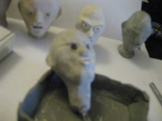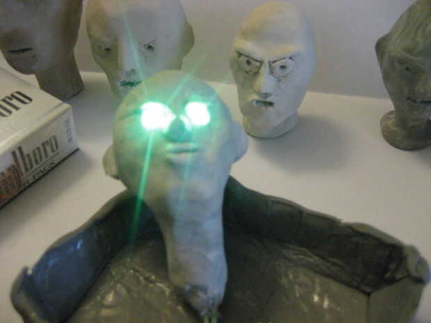 rescatados 2 LED de un dólar almacenar cadena luz Halloween y construido en una armadura luego dispararon a cabeza de Sculpey... no esperaba mucho (calculado hubo un 75% de probabilidad de las bombillas no sobreviviría el tiempo en el horno, y ya que eran muy baratos que pueden quemar... generalmente es una mala idea para construir un componente en una escultura porque quitando y repararla son probablemente imposible).