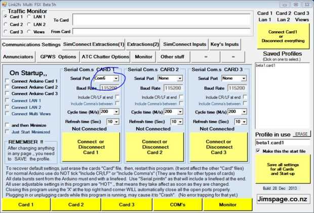2) Abra Multi FSX y Set puerto Serial de la tarjeta 1 para ser igual que Arduino. Si vuelo Sim X es abierto, Multi FSX se tome automáticamente los datos del juego.