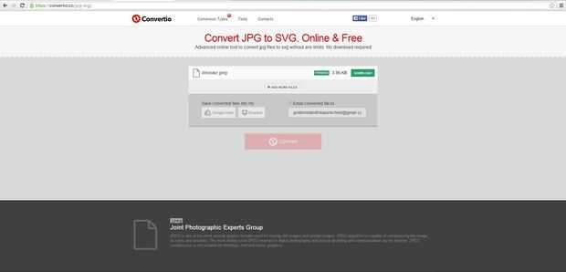 Utilizando herramientas en línea gratuitas, ahora convertiremos el archivo jpg en un archivo .svg. El sitio que usé es aquí: Convertio.co.