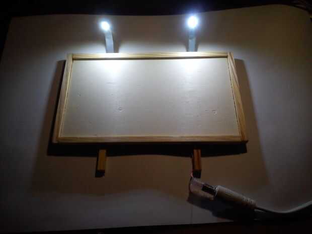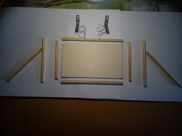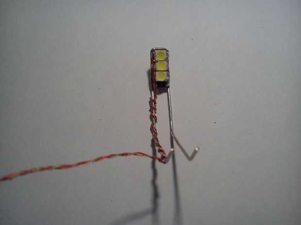 Para las luces de billboard desoldar los pequeños SMD LED de la tira, puse directamente al lado del otro y soldado nuevamente juntos que no era bastante complicado. Después doblar un clip como se aprecia en la foto, caliente había pegado el LED a él y cubiertos con cinta gris. La Junta sí mismo es hecha de pequeños pedazos de madera y pegada con pegamento de madera. Que une las pequeñas lámparas y probado. Luego he añadido una pieza de papel impresa.