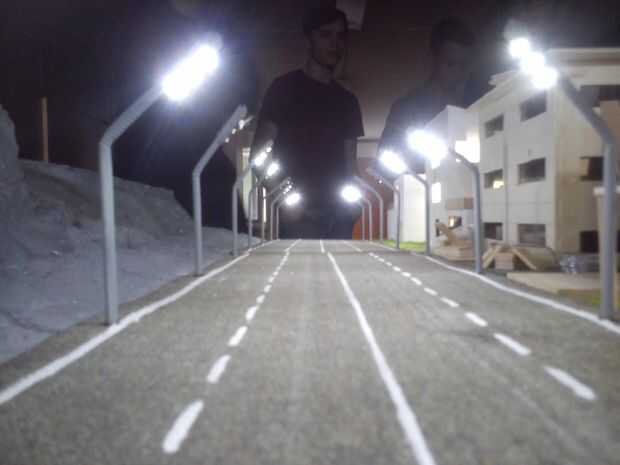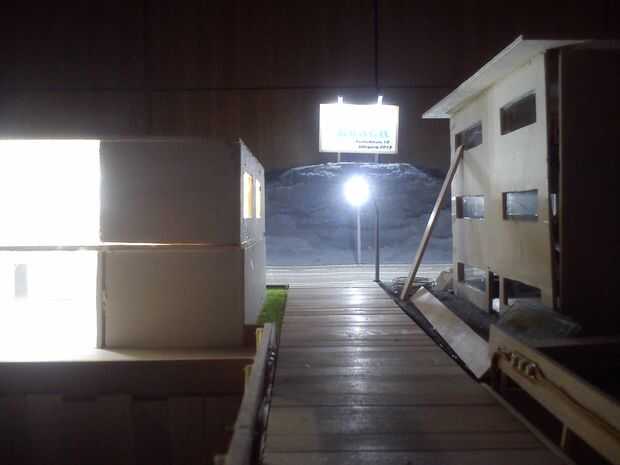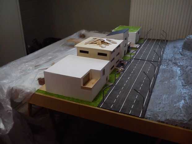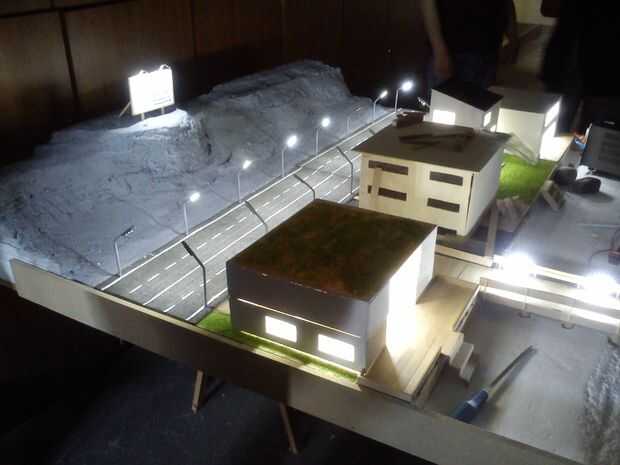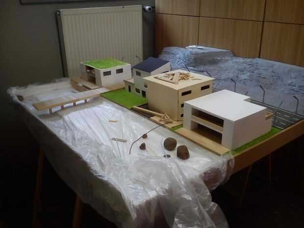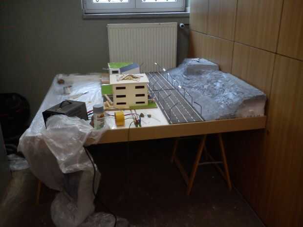 En nuestro último día corrimos fuera de tiempo así que arena y piedras azules como el agua se añadieron más tarde y no se pueden ver en las fotos. Por último juntamos las diferentes partes: las casas, la calle y el puente maravillosamente hecha a mano. Tomamos la placa base y lleva en nuestro salón de las escuelas, donde fue colocado en la parte superior dos escritorios y enchufado. Ve muy bien y estábamos todos orgullosos y felices de que nuestro trabajo sería visto por los estudiantes y profesores para las próximas semanas.