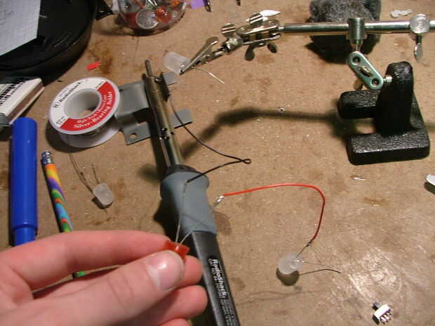 Soldar el LED en serie (con suficiente cable entre cada uno para que ellos puedan alcanzar su posición en la nariz del cohete) con el interruptor y dos cables a la batería. Para hacer todo esto, en primer lugar encontrar la polaridad de cada LED y dobla uno de los conductores (del mismo lado para cada LED) hacia fuera. Luego soldar todos los componentes según el esquema. Todo en cinta eléctrica para guardarlo de caer aparte y luego continúe.