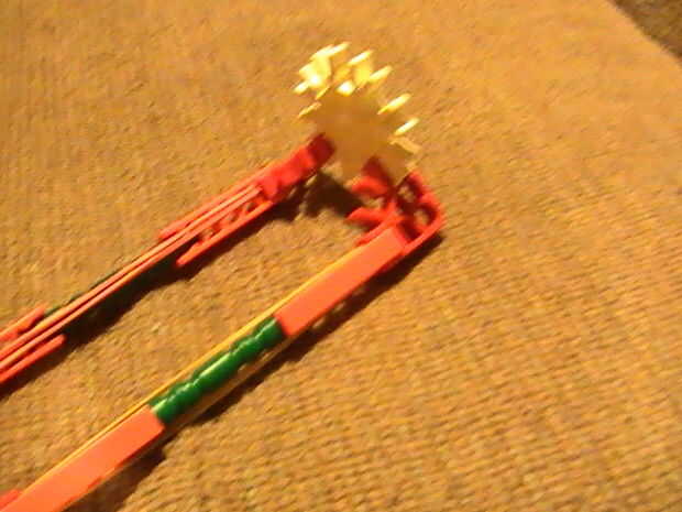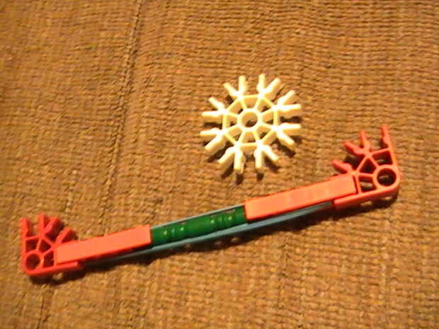 2. para la carencia de piezas he utilizado sólo una barra verde en el medio pero para mejores resultados use el modelo Ds desde el último paso. Hacer 4 o 8 modelo Ds y añadir rojo conectores a cada extremo. También agarra 2 copos de nieve blancas.