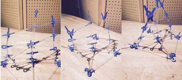 Presione la paja ½ longitud en ambos extremos de un tramo de 2. Presione cada una de las patas restantes de la 2 a la base del rayo de una pierna 1. Fije el rayo 1 pierna al extremo abierto de la paja de longitud ½. Deslice la escalera sobre eje de centro de ayuda de la base a través de la pata central de 2. Coloque las patas exteriores de 2 en el extremo abierto de la 1/4 pajitas de longitud conectado libremente a la central concentrador apoyo vigas (o nivel inferior para filamentos sucesivos). Pulse nuevo ¼ paja de longitud en el otro extremo de las patas de 2 exteriores para sujetar al siguiente nivel hacia arriba. Repita este proceso hasta que tengas 3 tres filamentos de escala completa. En este punto se deben descansar los peldaños de escalera de tres en una escala bastante recta apoyada por la central. Ahora tenemos que iniciar el giro helicoidal.