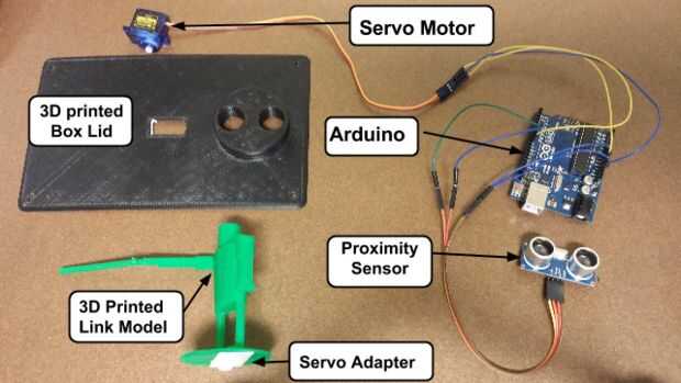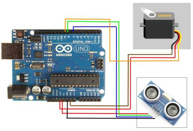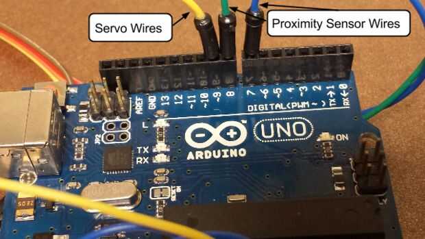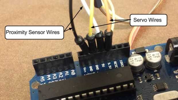 Usted necesitará tomar los 4 puentes m2f y enchúfelos en el sensor de proximidad. Entonces conecte los puentes restantes de m2m 3 3 ranuras terminal del motor servo. Estas ranuras son asignadas por los cables de color naranja, rojos y marrón. Conecte un cable a cada una de estas ranuras. Ahora, todo lo que necesitamos hacer es estos dos objetos de alambre en el Arduino para que pueda recibir datos desde el sensor y transmitir datos al servo.