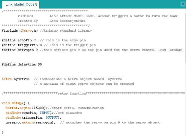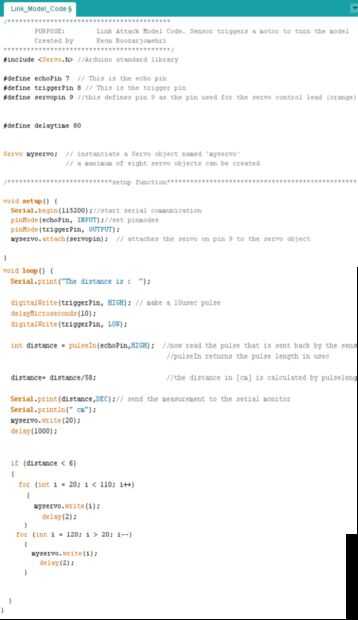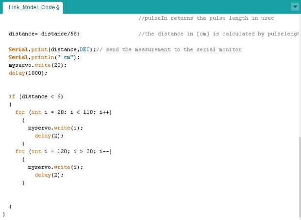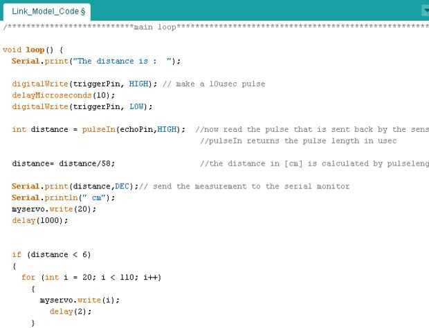 - Este código utiliza la información del sensor de proximidad de los puertos 7 y 8 para saber cuán lejos está un objeto. Basado en esa distancia, el Arduino tampoco activará el motor Servo gire 80 grados una forma, y 80 grados otra manera, o hacer nada. Arduino utiliza puerto 9 a cómo mover el motor Servo.