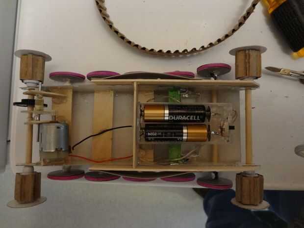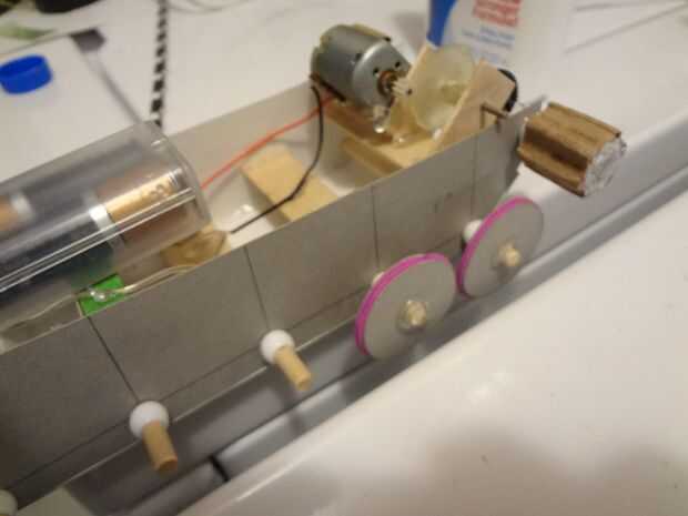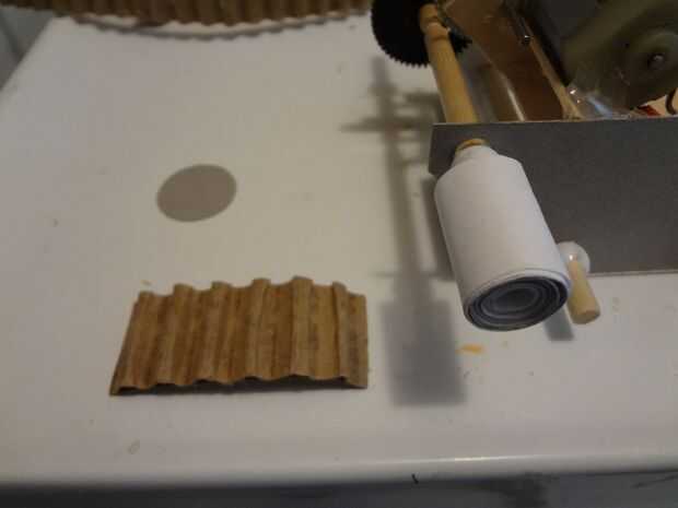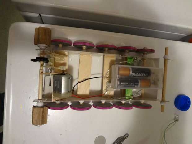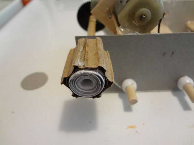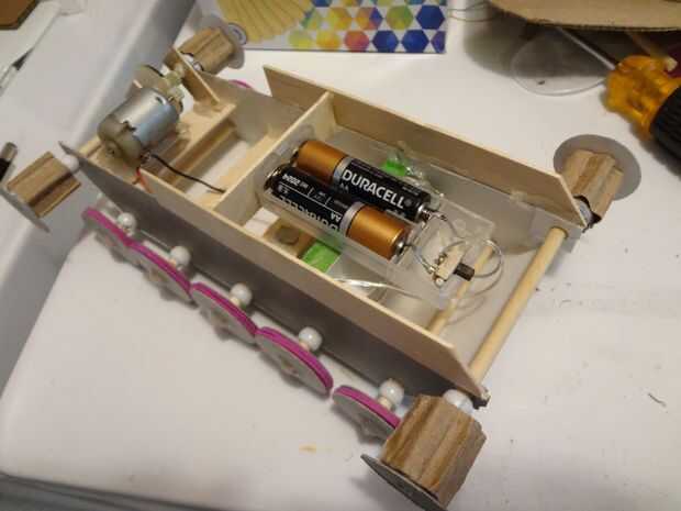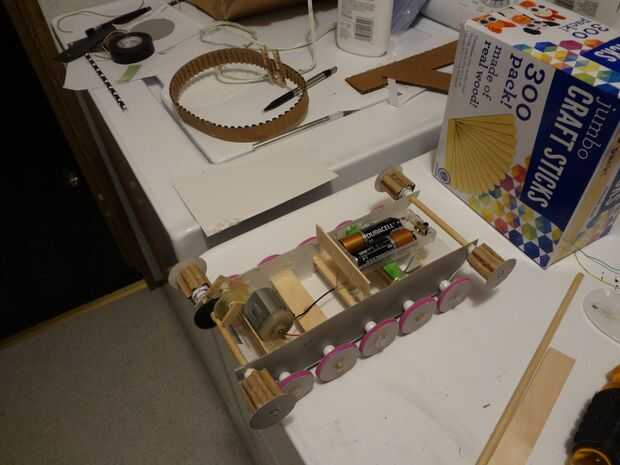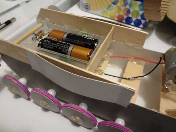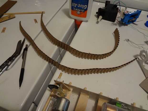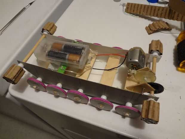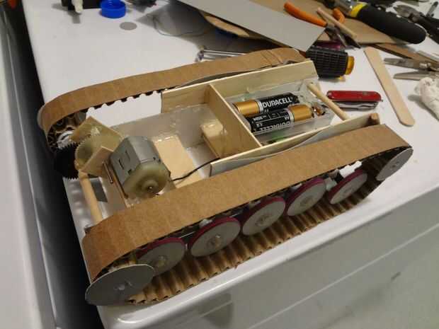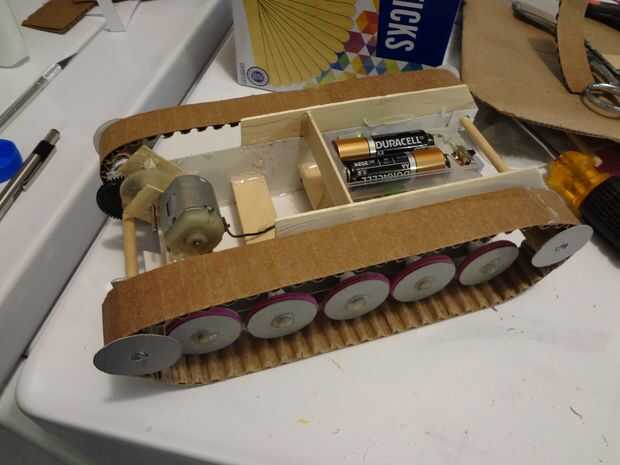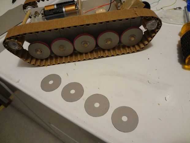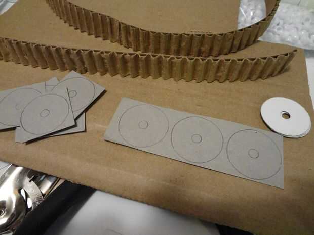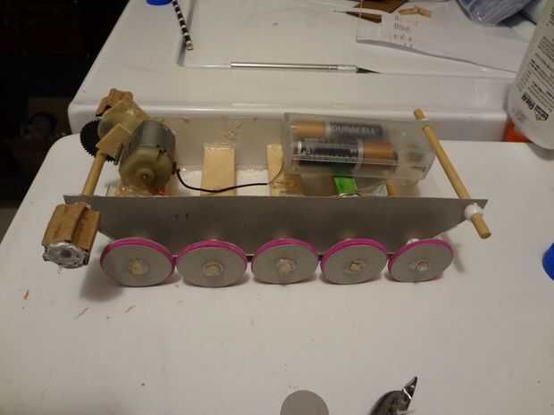 Ahora que encontrar un buen trozo de cartón corrugado y decidido lo ancho necesito la pista para ser. Luego cortar un trozo de cartón para la pista & Retire cuidadosamente la capa de un lado la parte acanalada. Yo doble la cartulina entre cada corrugación para hacer más flexible la pista. Hacer el centro de 10 ruedas de pista con cartulina 2 capas de espuma de hoja fina en el medio. Yo recorte la espuma en exceso a donde es ligeramente más grande que el círculo rueda stock de tarjeta externa que la espuma es lo que en contacto con la pista interior. Me caliente pegamento a los 5 ejes centrales. El eje motor que uso una hoja de papel de la copiadora y corte una tira del mismo ancho que la pista. Usar elmers pegamento en cola sobre el eje motor envolviéndolo alrededor y alrededor y añadir lo suficiente para hacer elvolante de tamaño adecuado. Uno en el lado opuesto hacer el tamaño exacto por la misma cantidad de papel de embalaje. Una vez que el pegamento elmers seca luego pegamento caliente un pedazo de cartón corrugado alrededor el papel impulsor que tiene suficiente circunferencia para permitir 6 corrugaciones en el cubo correcto espaciados para encajar en el cartón corrugado de la pista. Hacer al eje trasero básicamente lo mismo. I luego envolver el cartón pista alrededor de las ruedas dejando suficiente holgura así que debe resultar bastante fácil. Caliente pegar juntos & hacer lo mismo con el lado opuesto. Las pistas requieren un poco de corte y reglues para que funcione correctamente. En la parte trasera la pista mantuvo deslizarse más allá de la 5ª rueda de ejes inferior a un lado así que tuve que re pegamento caliente hub más utilizando un pequeño pedazo de cartón paja para extenderla hacia fuera y caliente pegado sobre la clavija de madera. Lo hice del otro lado la misma mayoría para hacer los lados coinciden con desde el otro lado estaba sufriendo no caiga de la pista. Tuve que pegar círculos stock de tarjetas más grandes de los centros sobre los centros superiores que ayudó a mantener la pista en el lugar. Seguir de ir hacia adentro hacia el cuerpo del tanque simplemente cortar un trozo de cartulina y curvadas hacia fuera y caliente pegado en su lugar como un espaciador para mantener la pista del cuerpo del tanque. Después de un montón de tweeking finalmente logró conseguir el chasis de trabajo lo suficientemente confiable por lo que podría pasar para el cuerpo del tanque.