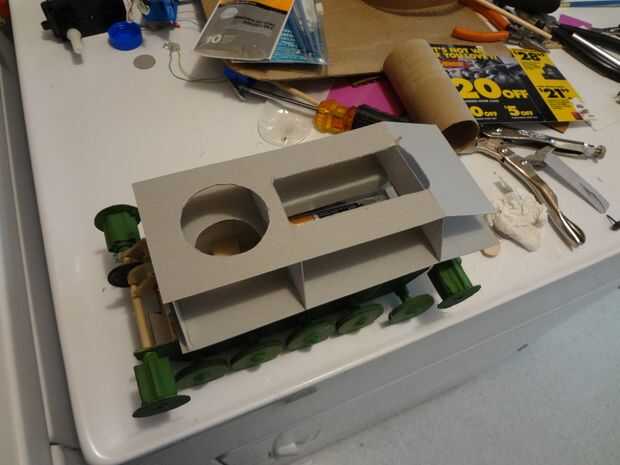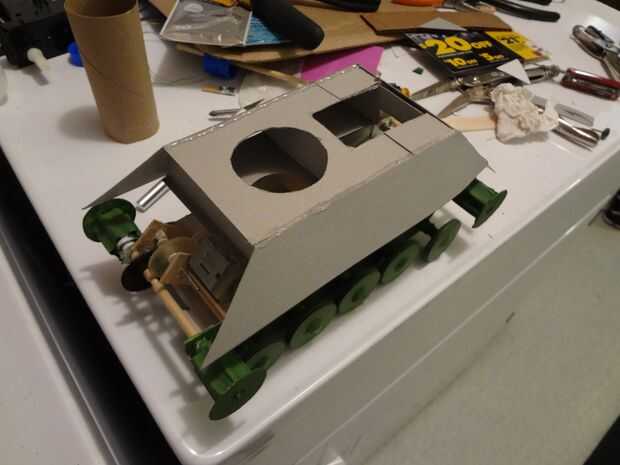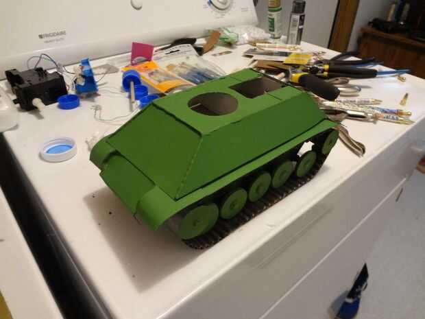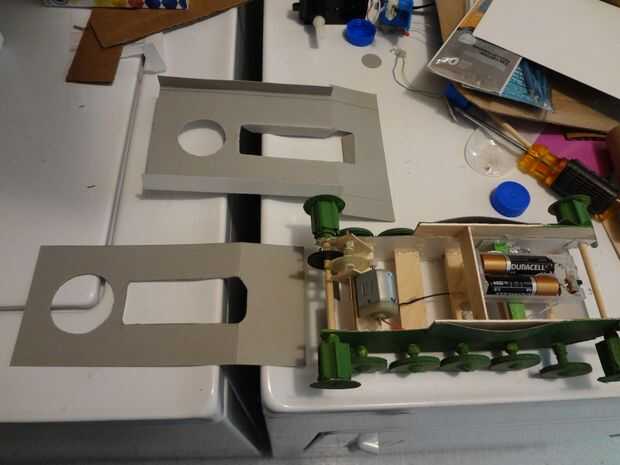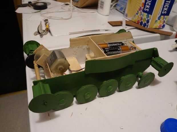 Antes de comenzar con los paneles de la carrocería iba adelante y había pintado el chasis y las ruedas con 2 capas de pincel en la pintura de acrílico. Ahora empiezo en los paneles de la carrocería utilizando cartulina y caliente los pegado en lugar. Corte el orificio de las baterías y el agujero de la torreta. También corte un pequeño agujero sobre los engranajes para darle un lugar para engrasar los engranajes cuando sea necesario. Luego pintar las pistas con una fina capa de pintura de acrílico del cepillo (no quiere usar demasiado ya que la pista ha de permanecer fácilmente flexible). Ahora pinto el cuerpo con 2 capas de acrílico del cepillo en pintura. Está empezando a parecerse a un T34-88 en este punto.