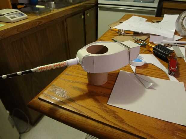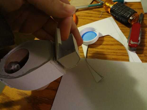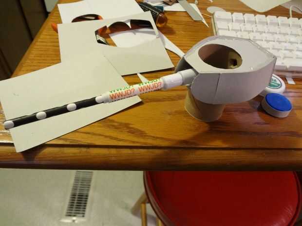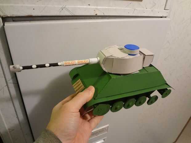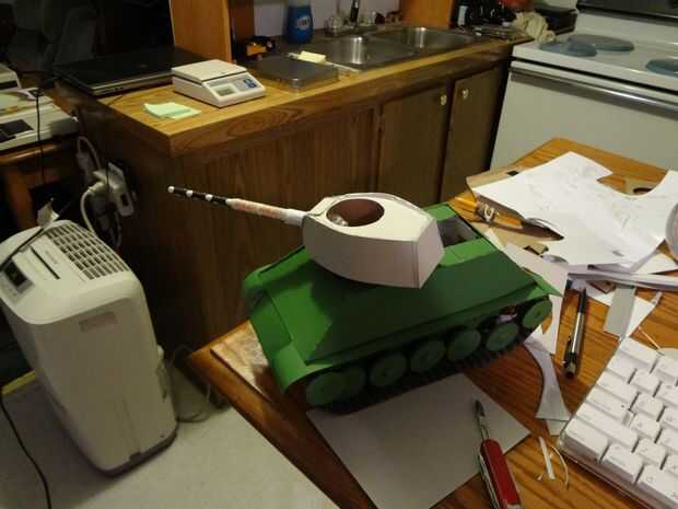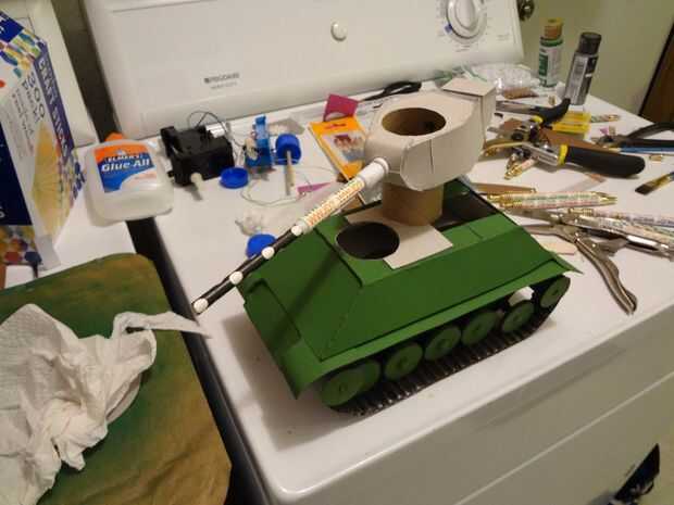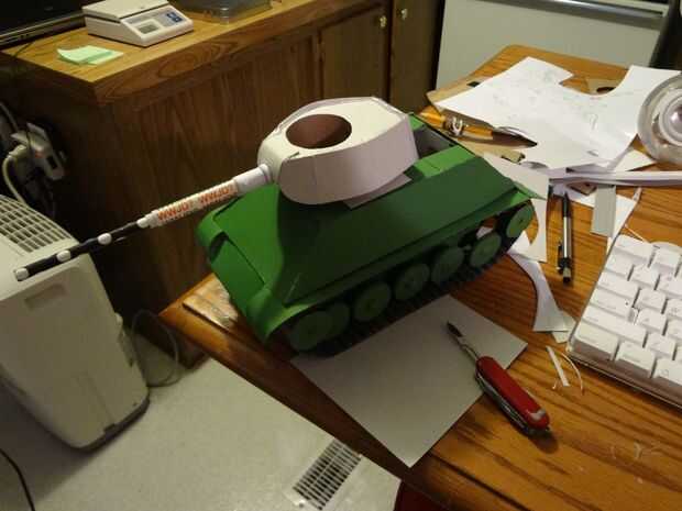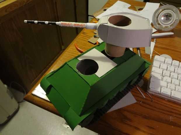 Usar cartulina para hacer la torreta. Yo comienzo mediante el esbozo de la base de la torreta y luego realizar la parte superior de la torreta justo un poco más pequeño que el inferior. Corte un agujero en el centro de la parte superior e inferior de la torreta y pegamento caliente un viejo rollo de cartón en su lugar. Cortan los lados de la torreta de cartulina y pegamento caliente en el lugar. I hacer la caja de herramientas en la parte posterior de la torreta y la parte superior de la bisagra así la parte inferior de la misma puede pivotar hacia fuera de la torreta. También fije la tapa para abrir la caja. Ahora empiezo trabajando en agregar el cañón en la torreta. Utilizar una pluma en tubo para la parte posterior de la porción, un cartón paja para la parte delantera que me caliente pegado en el tubo de la pluma. Para hacer la parte de atrás la mayor parte de la barrica más grande lo simple envuelto un pedazo fino de papel alrededor de él con pegamento para mantener en su lugar. La boca en la punta del cañón he hecho de un pedazo de cartulina. Con todo caliente pegado firmemente en la torreta podía terminar los detalles como la parte de carga de shell del cañón que se encuentra dentro de la torreta, el asiento de cargadores, granadas, todos hechos de cartón y cartulina. También terminé la parte de la torreta en la barra con corte común tarjeta para caber alrededor de donde el tubo entra en la torreta y caliente pegado en su lugar mientras doblando y sujetando en posición. También he quitado la mayor parte del tubo de cartón original que corría hacia abajo por el interior de la torreta dejándole lo suficiente como para permitir que la torreta sujetar firmemente hacia abajo en el cuerpo del tanque pero siguen siendo fáciles de quitar.