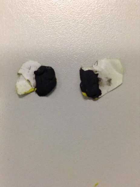 corta dos pequeños círculos en el papel un óvalo más pequeño de barro negro del molde y poner uno en cada uno de los círculos. Luego pegar los ojos por encima de la boca que desee.