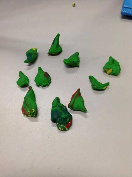 molde aproximadamente 10 triángulos más grandes de arcilla verde y disponerlas como se muestra hasta arriba.