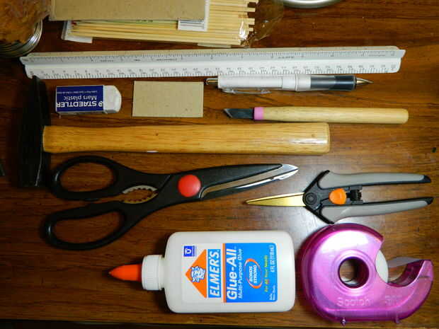 Materiales: cartón de la caja (ver imagen de referencia), pegamento de Elmer, tijeras, cuchillo de la manía, cinta, lápiz, borrador, regla, palillos / brochetas, martillo, fotos (como guías para el modelo)