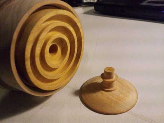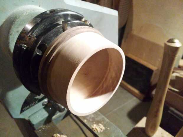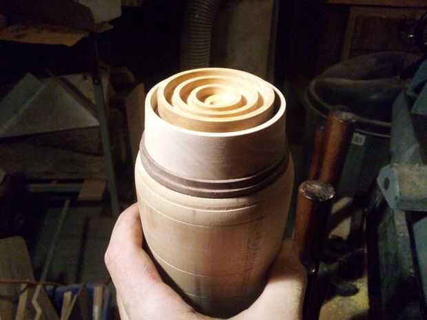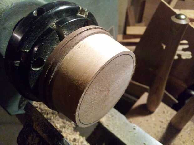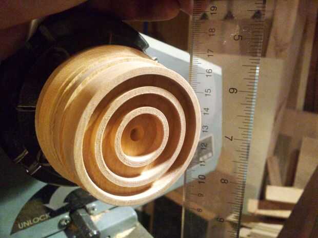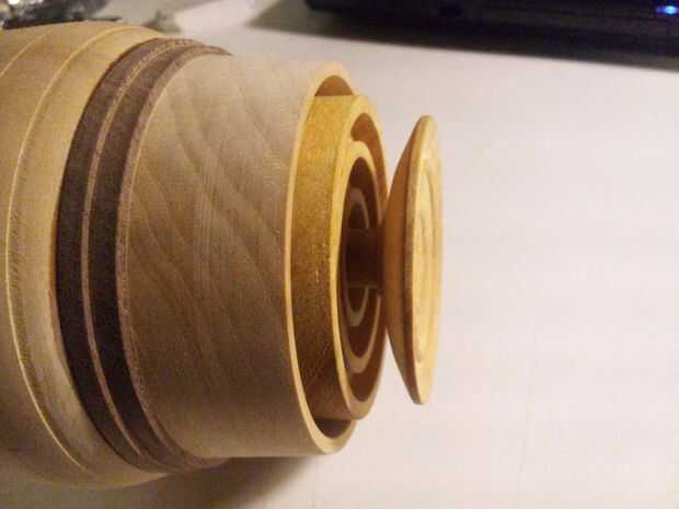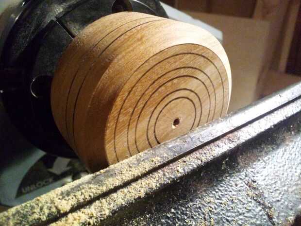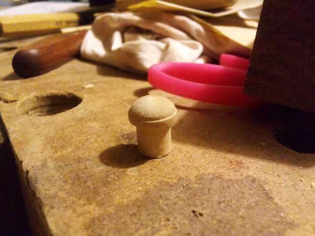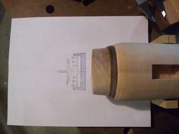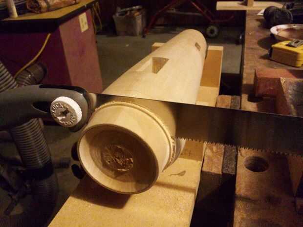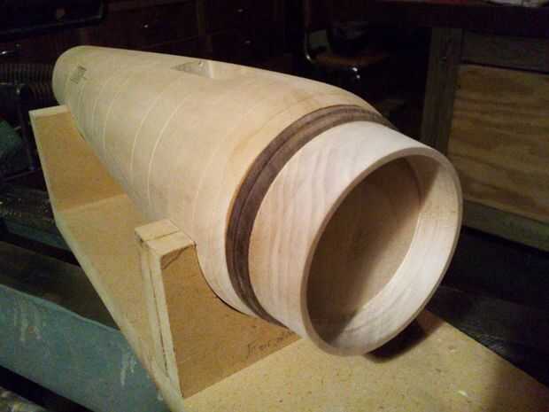 El faro se convirtió en el torno y el agujero fue perforado hacia fuera. El avellanado fue tallado, no perforado, para evitar que la madera se masticó arriba. La base para el plato deflector y el plato sí mismo se hizo de la naranja de osage, para emular el color cobre del modelo de estudio. El reparto de los pin es de padauk y la pieza pequeña se hace de corazón amarillo.