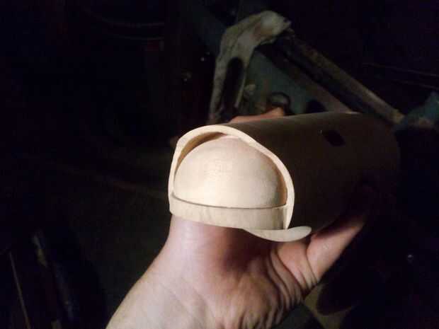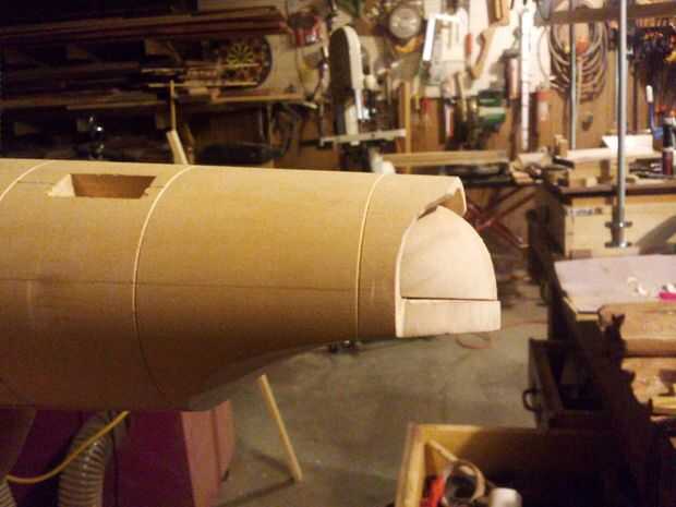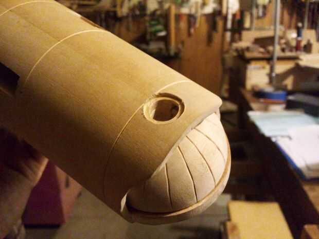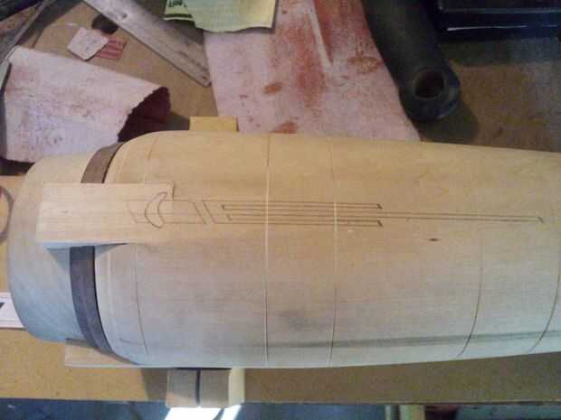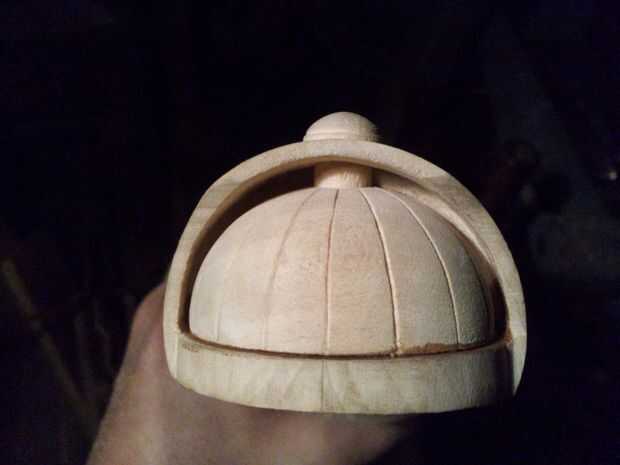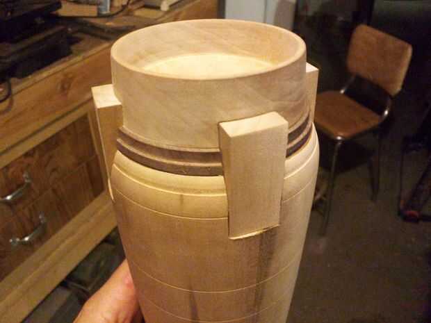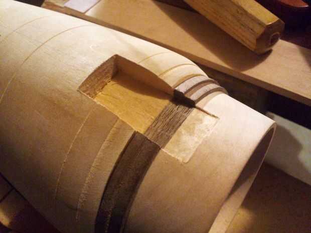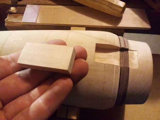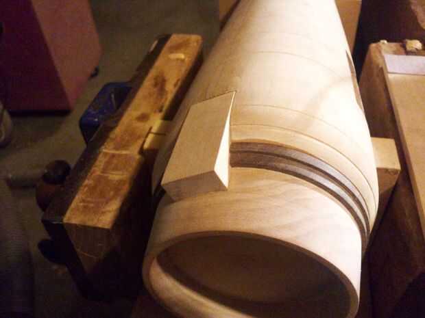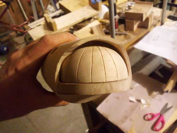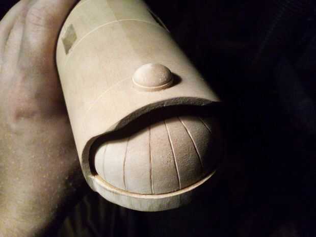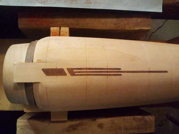 El shuttlebay fue tallada hacia fuera, creando un labio grueso de 3/32". Las puertas de la cáscara de la almeja se dio vuelta en el torno y recortadas a mate dentro del nicho. Las marcas de separación de las puertas fueron hechas con un cuchillo jamonero de chip.