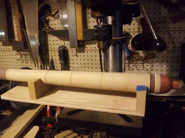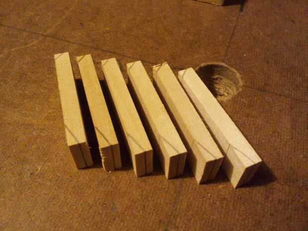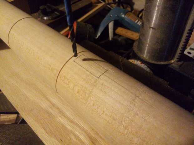Las ranuras para montar los motores en los pilones de apoyo fueron marcadas hacia fuera en un ángulo de 45 grados a la vertical. Se perforaron agujeros de guía para facilitar el tallado hacia fuera de las ranuras. La lámpara fue hecha para sostener los motores de tal forma que el eje longitudinal se mantiene paralelo a la superficie sobre la que descansa. Esto asegurar que cualquier orificio taladrado utilizando el taladro será perfectamente perpendicular al eje.