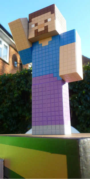 Basado en mediciones de Minecraft, Steve es 32 píxeles de alto que le hace de 1,875 metros largo, lo que significa que 1 píxel es aproximadamente 5,859 cm largo en el juego. El tamaño de azulejo cuadrado de estireno que estoy usando es 6,3 mm (o 1/4") para la escala de esta pieza es de escala 1:9. La longitud total de este modelo es de 20,8 cm de largo. (o 8 pulgadas)