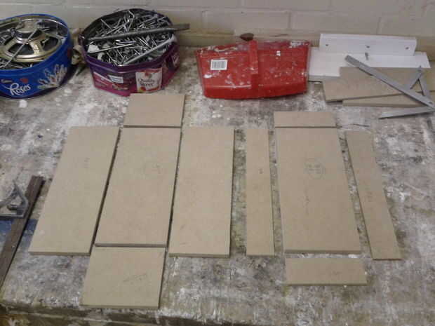 Cortar cada pieza usando cualquier herramienta de corte eléctrica que tienes; Cualquier cosa que corta recto como una sierra de mesa es ideal para esto pero hice hacer con un buen ol ' Jigsaw.