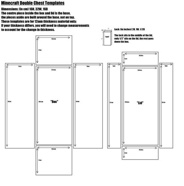 El pecho doble es muy sencillo; tiene una tapa, una caja y un bloque pequeño de plata. En centímetros, la caja y la tapa Junta es 16 H, 32W, 16 D y es la pieza de bloqueo (en pulgadas) 2" H 1" W y 1/2" D.