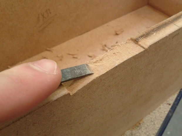 Para las bisagras, usted necesitará 2 ranuras en la caja y la tapa del canal. He utilizado herramientas del grabado desde su pequeño y aseado pero si tiene pequeños cinceles, aconsejaría utilizarlas en lugar de otro. Limpié el canal con una escofina y papel de lija para nivelar lo mejor posible.
