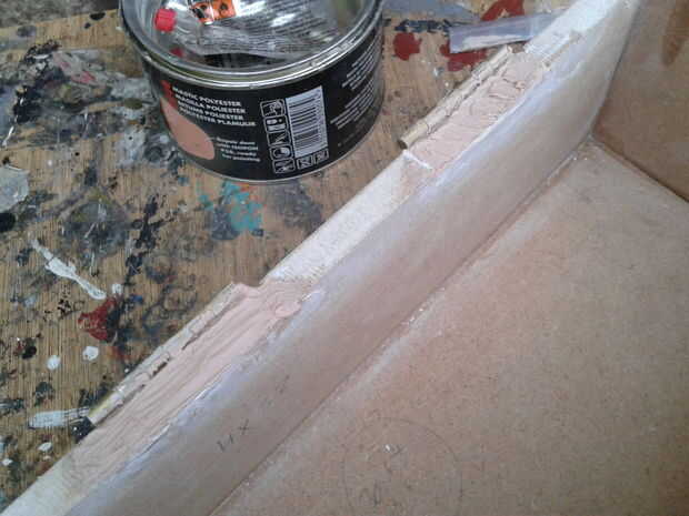 Si elige para llenar el cuerpo sobre las bisagras, asegurarse que todo está perfectamente alineado como no podrás sacar las bisagras una vez que comienzas y guarde en la nota que si haces esto, puede atascar el mecanismo de bisagra si aplicas demasiado sobre el pivote. Hice unos pases para construir poco a poco espesor y así puedo evitar estorbar el pivote. Una vez que el espesor es construido, lijar al ras con el borde.
