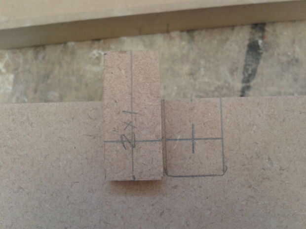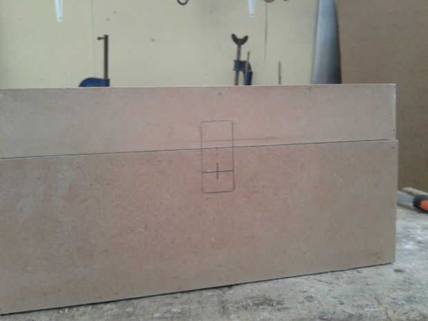 Con la pieza de bloqueo recorte de la plantilla, se encuentra el centro de la caja (ya que la caja es de 32cm, mi punto medio era 16cm) y dibujar un contorno de la pieza de bloqueo alrededor de la caja. La cerradura va pegada a la tapa así que dibujé el contorno 1/2" por encima de la caja.