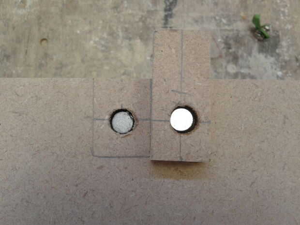 Ahora que la tapa de las bisagras hacia arriba y hacia abajo libremente y que el punto de encuentro frontal quede alineada, podemos ahora avanzar en el cierre. Es muy importante que la tapa y la caja son completamente uno con el otro porque los imanes necesitan de contacto plano para ser eficaz; Si los imanes no tienen un contacto adecuado, el seguro pierde contacto magnético y representar casi inútil.