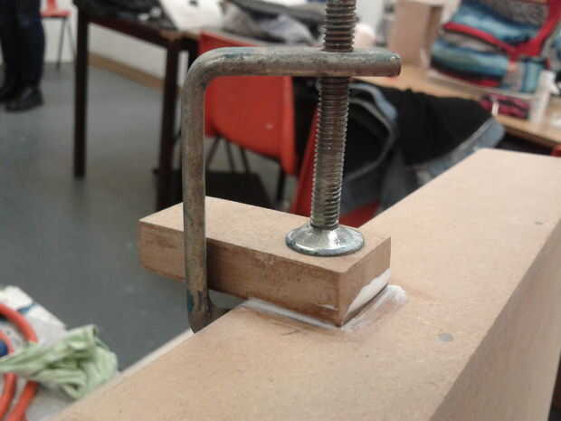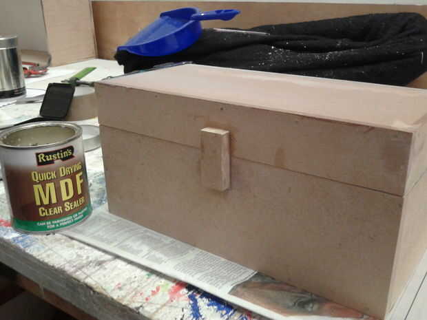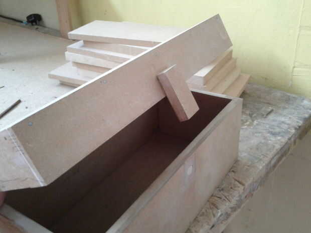 Por último, sólo la arena detrás el relleno para nivelarse con el MDF y se adhieren a la parte superior 1/2" de la pieza de"lock"con pegamento a la tapa usando una pinza pequeña de madera. Martillar un clavo en la parte posterior de la cerradura a través de la tapa es opcional pero aumentará aún más la fuerza de la Unión.