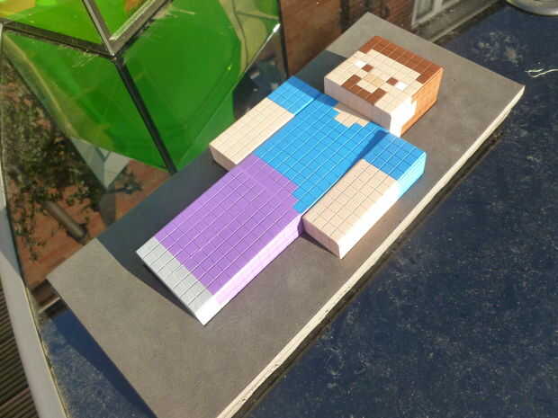 Las piezas pueden colocarse ahora en el cuadro; la ranura de la cabeza va primero con el contorno en la parte superior. no hay necesidad de pegamento ya que la espuma quede con fricción pero si desea pegar la espuma, puede utilizar cemento de contacto (pegamento UHU o pegamento de contacto súper 77) o utilizar pegamento buen ol ' a virar en su lugar. Steve ahora está asegurado!