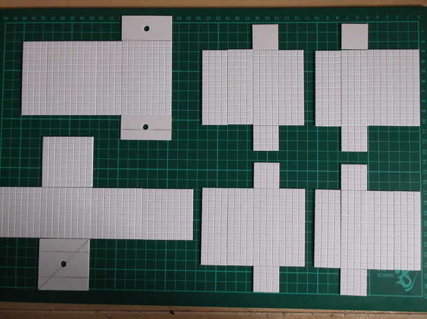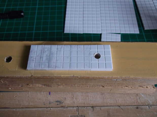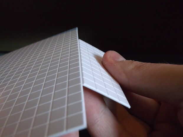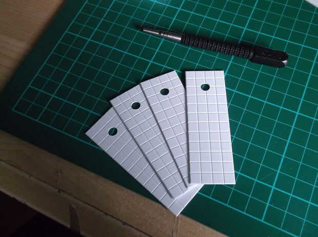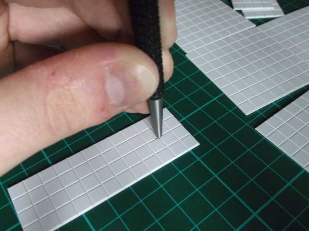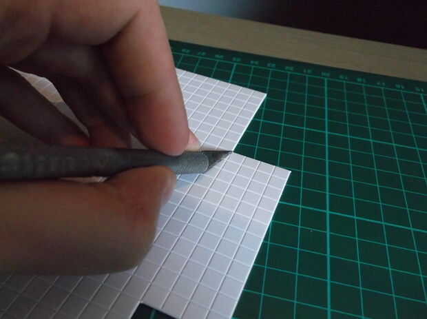 Una vez tienes tus plantillas, es necesario cortar todas las piezas en la baldosas de estireno; Esto es particularmente fácil porque la cuchilla X-acto corren a lo largo de las líneas de rejilla, lo que significa que siempre tendrá una línea recta. La manera más fácil de cortar estireno es marcar la línea, luego suavemente rápido la línea y se encajará limpiamente.