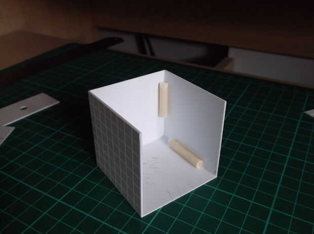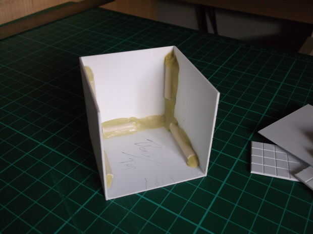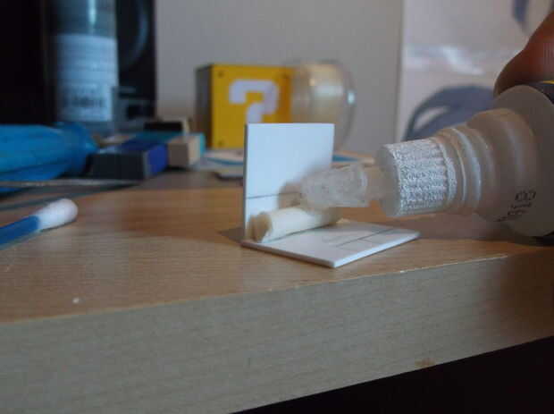 Con sus piezas, comenzar a usar poliestireno cemento para adherir las piezas juntos. La mejor manera de obtener una combinación de 90 grados es colocar ambas piezas contra un borde con una superficie horizontal y una pared vertical de 90 grados y ejecutar una línea de cemento a lo largo de la combinación del plástico y sujetar el plástico en su lugar durante unos 10 segundos.