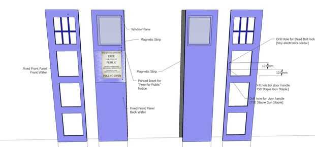 Ésta es la opinión de la parte trasera de los paneles. Tenga en cuenta las "bandas magnéticas" en el diagrama. esta Asamblea es lo que mantiene la puerta cerrada cuando usted tira cerrada en el modelo final. usted necesita medir y cortar tiras de 2 x 200mm de cinta magnética. Tomar una de esas tiras y cortar en lengthswise mitad para obtener tiras de 2 x 200mm, que son la mitad tan amplia como la tira original. Deben ser aproximadamente de 5mm de ancho.