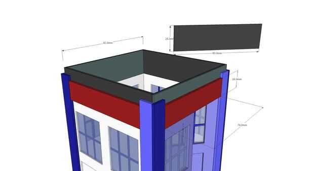 He utilizado algunos impares para colorear en los esquemas de primeros y la segundo por encima para que pueda ver claramente todas las partes y piezas. La pieza básica, tienes que cortar es un panel de aproximadamente 90 mm x 25 mm (importa las medidas), y recortas 8 de ellos para que se instale 2 piezas intercalados juntos a cada lado. El grueso agrega fuerza, pero al final: agrega grueso y parte del proceso aquí es intentar añadir tanto grueso como sea posible sin tener que construir muchas capas cuadradas hasta el techo. Si estás especialmente inteligente y cuidadosa, puede simplemente pegar las esquinas con pegamento. Si necesita añadir abrazaderas de las esquinas (como hice en mi 1,0 prototipo), Añadir entonces a la parte inferior de sus esquinas, no en la parte superior, que desea poder Deslice el ensamblaje del techo final (que construiremos en el siguiente paso) en esta Asamblea sin pegado cerrado.