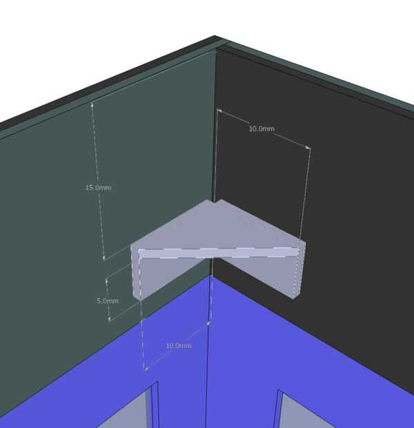 Antes de insertar el montaje de la cubierta en el cuerpo principal, tendrás que construir una repisa pequeña dentro de la corona de la Asamblea principal. La "cornisa" es realmente solo 4 estantes de rincón hundidos en la corona de la carrocería en 15mm, (ver diagrama tercera). Esto es para sostener el techo, pero para dejar el cuerpo abierto y accesible. Esto puede parecer algo innecesario puesto que la 1.0 versión de este modelo no tiene "cosas" internas (luces, cables, baterías, etc.), pero esto también nos permite construir este modelo con la posibilidad de actualizarlo si le parezca. Puede pegar cerrado si sólo desea sentarse allí con ninguna luz ni nada.
