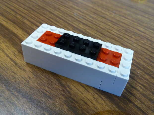 Coloque las dos placas al lado de unos a otros maneras largas en la parte superior del medio ladrillo blanco 2 x 4 de la segunda capa. Las placas de 1 x 4 no deben superponerse a cualquiera de los ladrillos rojos.